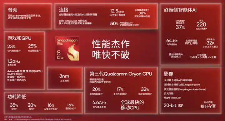 作为“全球最快的移动 SoC”,第五代骁龙 8 至尊版在各个环节都有大幅升级。它采用 3 纳米工艺制程,第三代 Qualcomm Oryon CPU 最高主频达到 4.6GHz,性能提升了 20%,全新架构的高通 Adreno GPU 带来了 23% 的图形性能提升,高通 Hexagon NPU 性能更是提升了 37%。