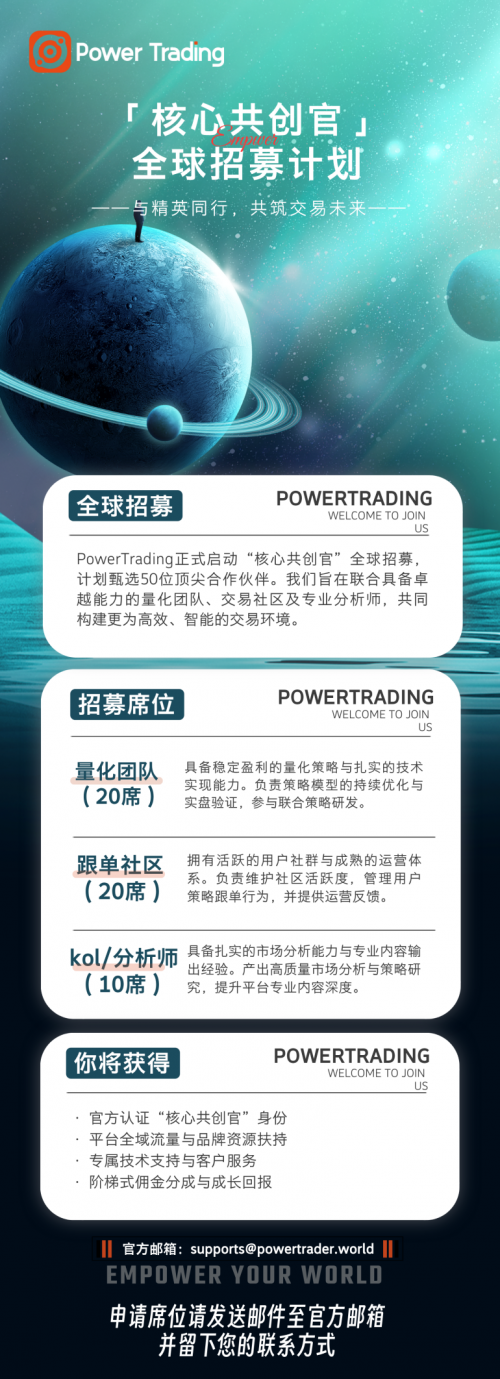 为践行全新企业理念,Power Trading 正式启动 “核心共创官”全球招募计划。该计划旨在于全球范围内,甄选50位顶尖的量化团队、资深交易社区领袖及具备卓越市场洞察力的专业分析师,成为平台的核心战略合作伙伴。